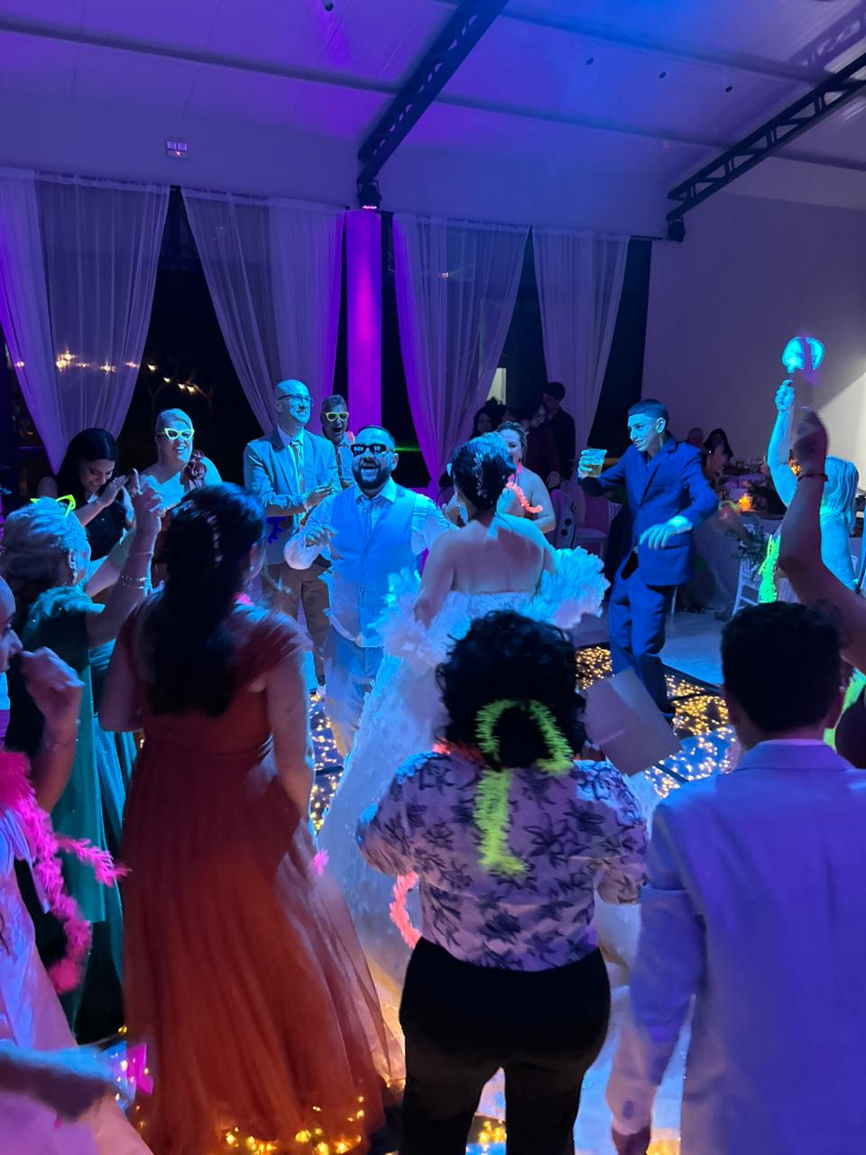 Som, iluminação cênica e DJ profissional para todas as fases da festa.