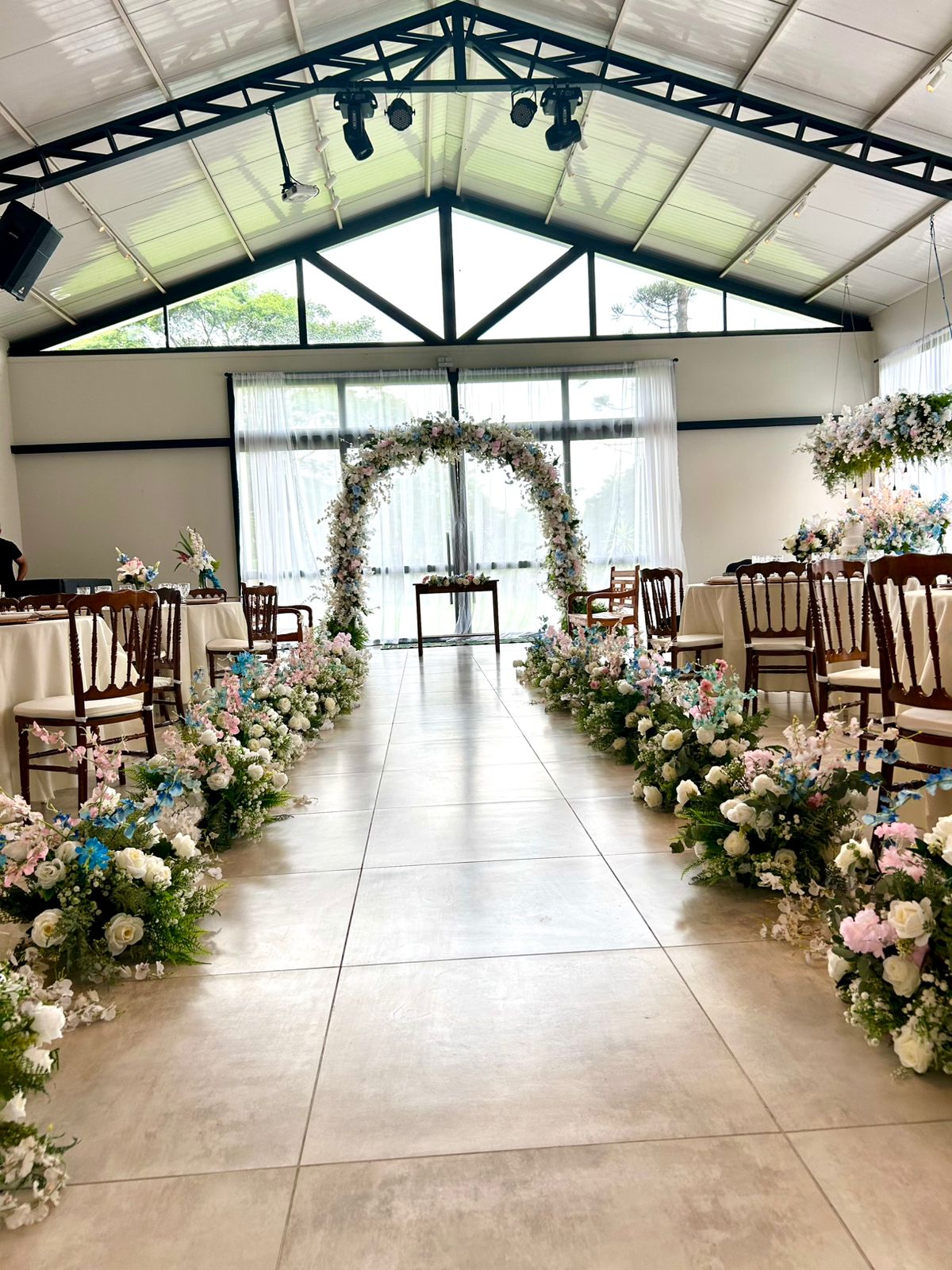 Arco, mesas, iluminação, velas e arranjos com flores permanentes (de altíssima qualidade) combinadas com folhagens naturais — visual elegante e duradouro. Opcional: decoração 100% natural e totalmente personalizada sob consulta.